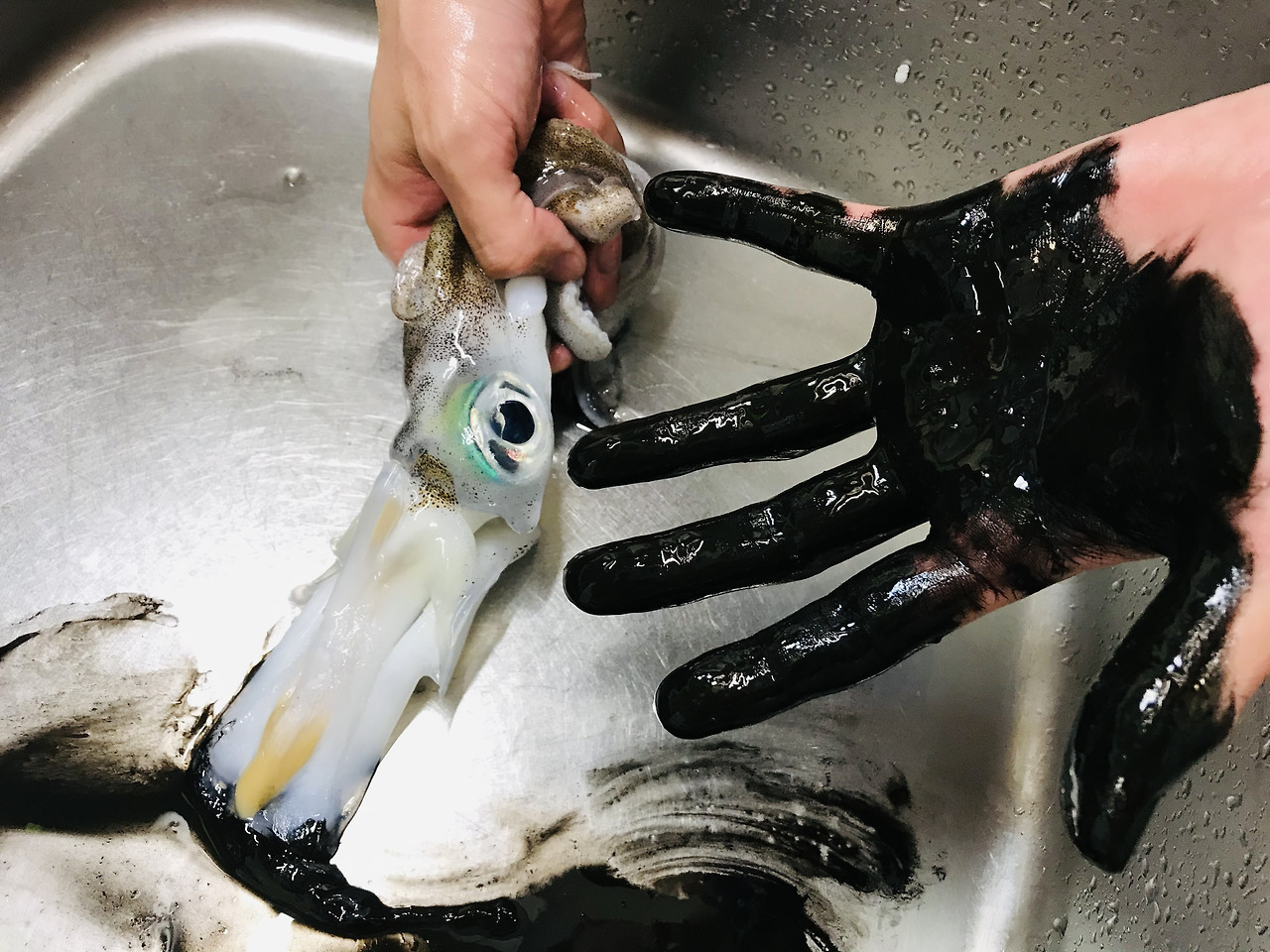 손질 단계에서 먹물이 터지면 색이 번질 수 있으므로 조심스럽게 작업하는 것이 중요합니다.