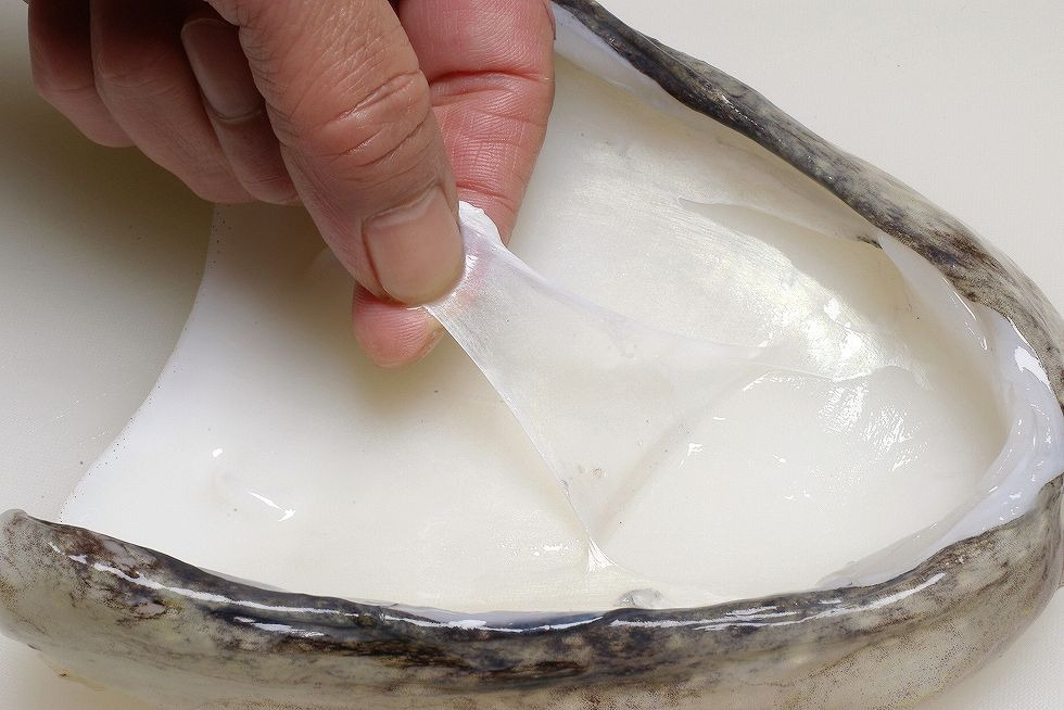 갑오징어 껍질은 질기므로 끝을 잘 잡고 당기면 잘 뜯어져 나옵니다.