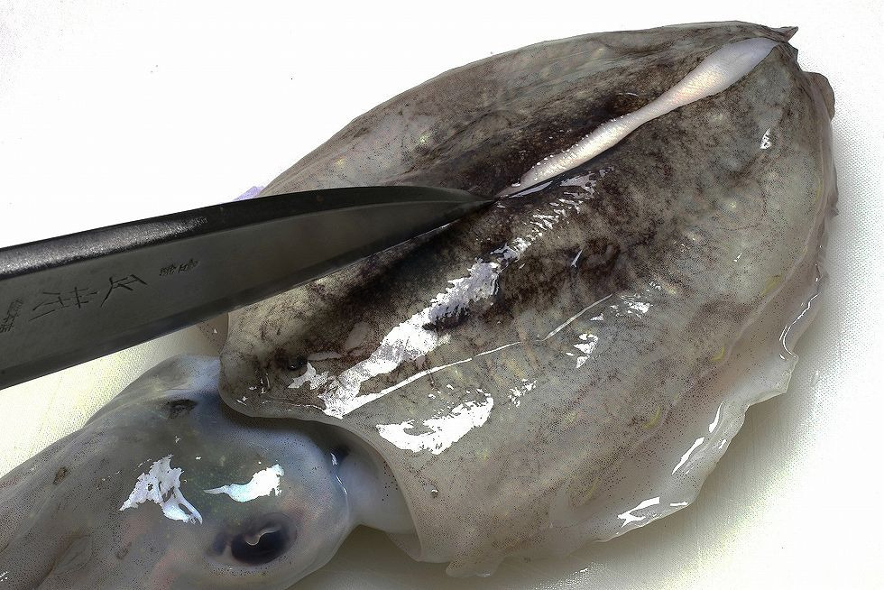 갑오징어의 갑을 꺼내고 내장을 제거합니다.