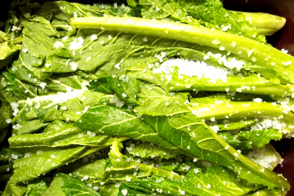갓김치의 첫 단계는 깨끗한 손질과 절임입니다. 갓은 흙이 많기 때문에 한 포기씩 잎과 줄기 사이를 세심하게 씻어야 합니다. 너무 오래 담그면 잎이 무르기 때문에 절이는 시간은 중요합니다.