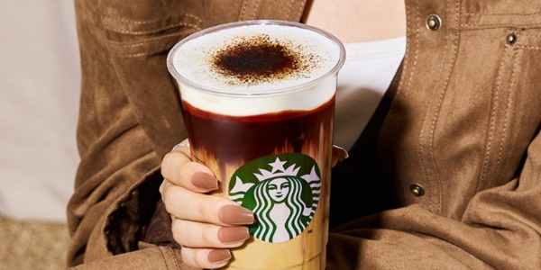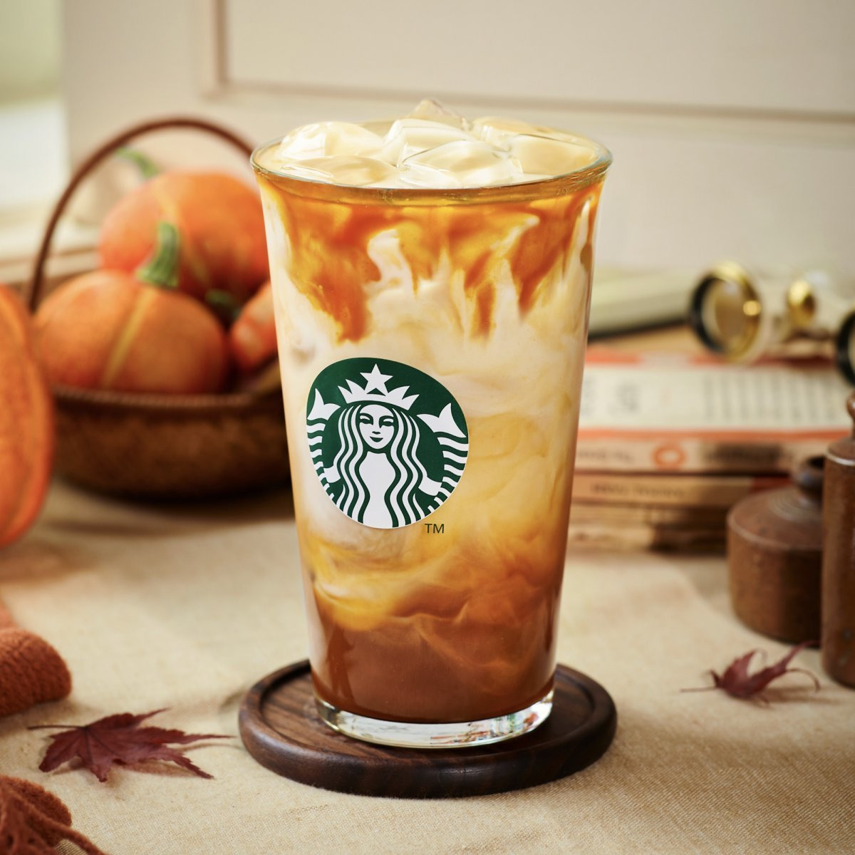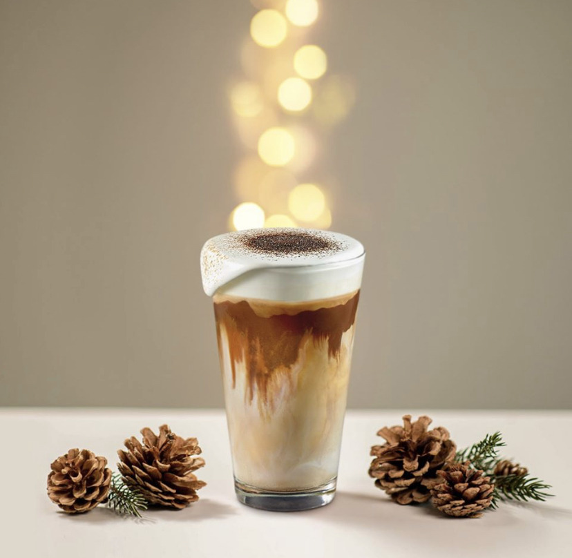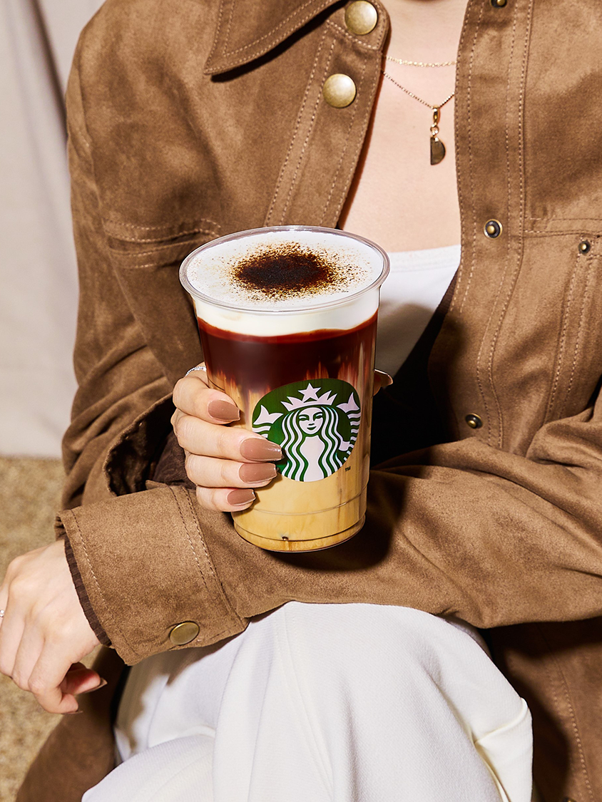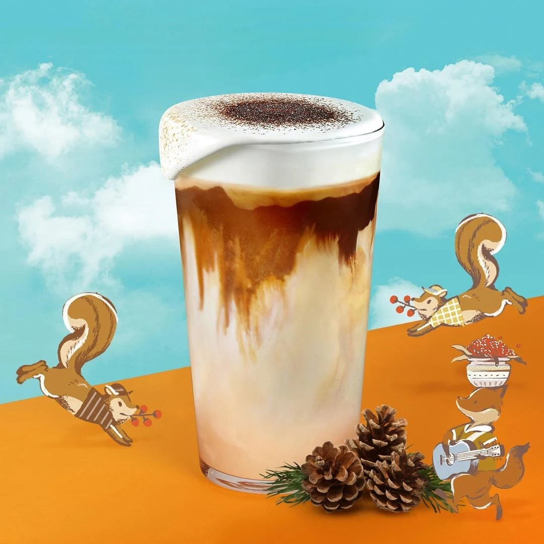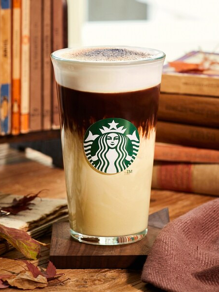 1. 가을 감성을 시각적으로 표현한 음료: 어두운 초콜릿 드리즐과 카라멜 파우더가 단풍을 연상시킵니다.