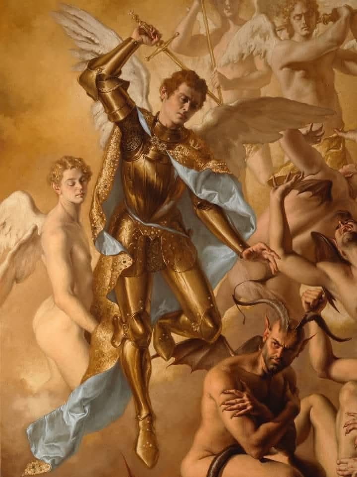 상크테 미카엘 아르칸젤레, 데펜데 노스 인 프로엘리오; 콘트라 네퀴티암 에트 인시디아스 디아볼리 에스토 프래시디움. 임페렛 일리 데우스, 수플리체스 데프레카무르: 투쿠에, 프린체프스 밀리티에 카엘레스티스, 사타남 알리오스쿠에 스피리투스 말리뇨스, 쿠이 아드 페르디치오넴 아니마룸 페르바간투르 인 문도, 디비나 비르투테, 인 인페르눔 데트루데. 아멘. - 핵심 해설