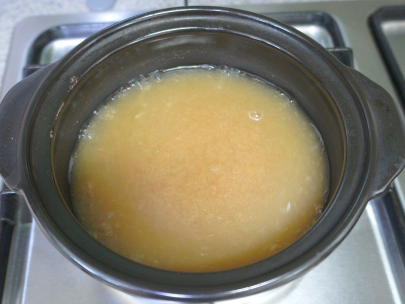 - 된장을 체에 풀어 넣어 덩어리 없이 풀기