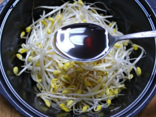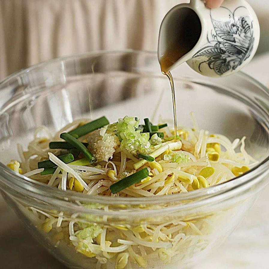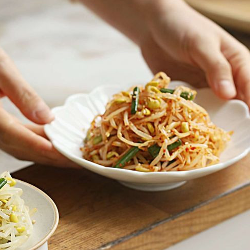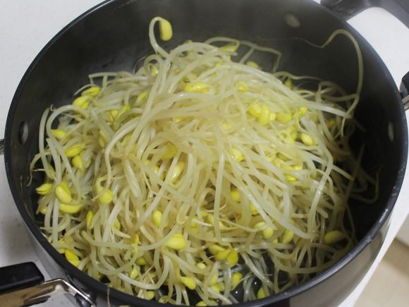 이때 손으로 세게 주무르지 말고 아래에서 위로 뒤집듯이 섞어야 콩나물 줄기가 부러지지 않습니다.