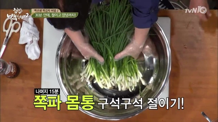 절이는 시간은 너무 길지 않게 해야 파가 물러지지 않으며, 소금의 양은 파 2kg 기준 약 3큰술 정도가 적당합니다.
