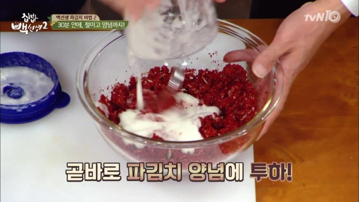 양념이 파에 잘 배도록 돕는 것이 찹쌀풀입니다. 냄비에 물 1컵과 찹쌀가루 2큰술을 넣고 중불에서 저어가며 끓이다가 걸쭉해지면 불을 끄고 식혀줍니다. 완전히 식은 뒤 고춧가루를 넣으면 고운 빛깔의 양념이 완성됩니다. 이 찹쌀풀은 양념의 점도를 높여 파에 골고루 붙게 해주는 역할을 합니다.