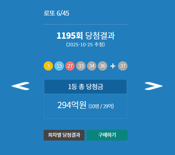 제1195회 로또 추첨 결과 1등 번호는 3, 15, 27, 33, 34, 36, 보너스 번호는 37로 확정되었으며, 1등은 10명이 당첨되어 각자 약 29억 3천만 원을 수령하게 되었습니다. 수도권과 영남권이 여전히 강세를 보였고, 자동선택이 압도적 비중을 차지한 것이 특징입니다. 로또는 단순한 운의 게임이지만 매주 1등 소식이 전해질 때마다 많은 사람들에게 희망과 꿈을 주는 상징적 존재로 자리 잡고 있습니다. 합리적 구매와 철저한 당첨금 관리, 그리고 당첨금 수령 시 유효기간 내 절차 준수는 필수입니다.
